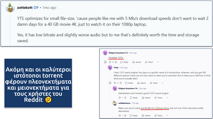 Τη δεδομένη χρονική στιγμή, τα YTS, 1337x και BT4G είναι μερικές από τις πιο δημοφιλείς ιστοσελίδες στο Reddit. Σημειώνεται ότι η δημοτικότητα των ιστότοπων torrent και οι απόψεις της κοινότητας αλλάζουν γρήγορα, γι’ αυτό προτείνεται η τακτική ανάγνωση των πιο πρόσφατων σχολίων και δημοσιεύσεων.