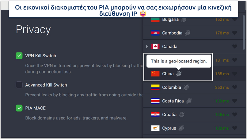 5. Private Internet Access (PIA) — Τοπικοί και διεθνείς διακομιστές σας προσφέρουν πολλές επιλογές για να παραμείνετε συνδεδεμένοι στην Κίνα