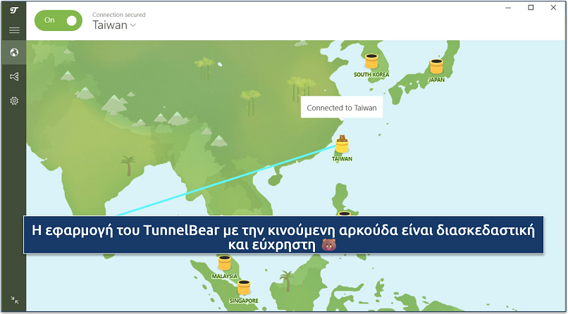 Η απλή διεπαφή του TunnelBear το καθιστά ένα από τα πιο εύχρηστα VPN στην Κίνα. Η επιλογή διακομιστή βάσει χάρτη είναι ευκολονόητη (απλά επιλέξτε έναν διακομιστή και το γραφικό με την κινούμενη αρκούδα θα ξεκινήσει να σκάβει τον δρόμο της από την τοποθεσία σας προς τον προορισμό). Δεδομένου ότι η Κίνα είναι μια μεγάλη χώρα, ο οπτικός χάρτης διευκολύνει και επιταχύνει τις διαδικασίες αναγνώρισης και σύνδεσης με τον πλησιέστερο διακομιστή.